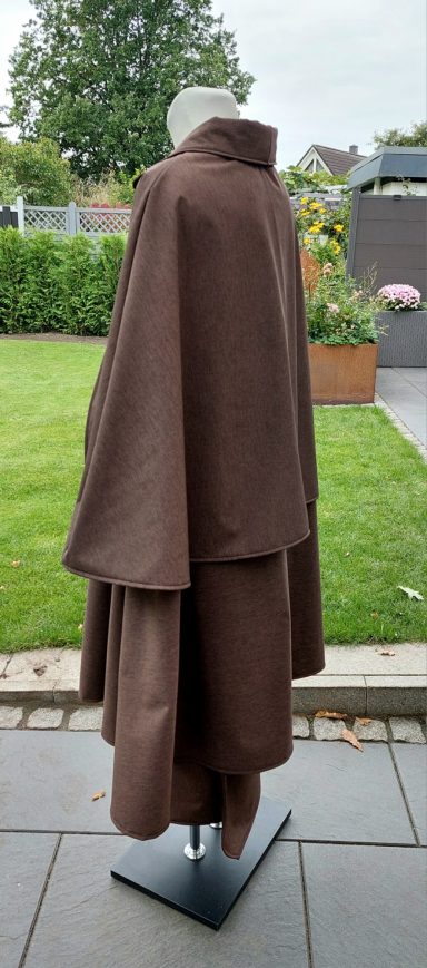Hier gezeigt ein langer Poncho und Bockschürze aus Softshell in braun. ( Kapuzenfutter kundenspezifisch )