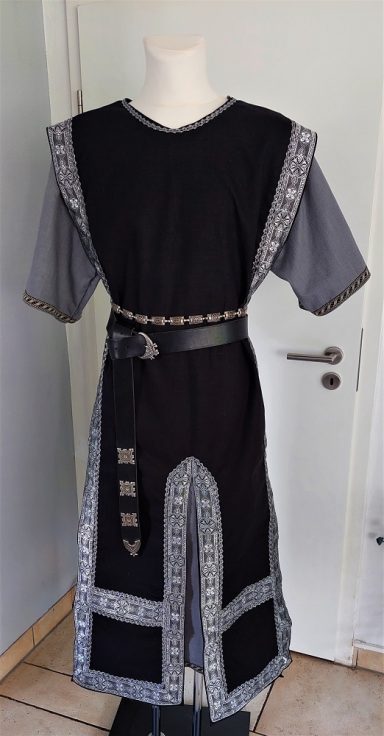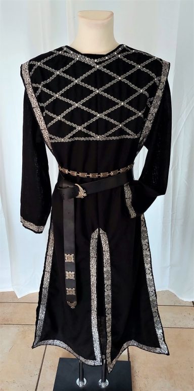 Tunika ( halblang) mit Waffenrock. Hier gezeigt aus einem schwarzen Leinen-Mischgewebe.Verziert mit einer Webborte.