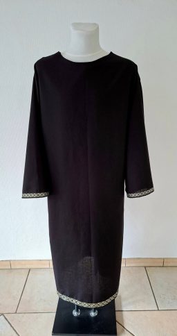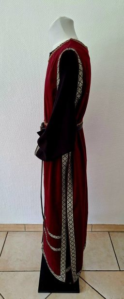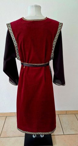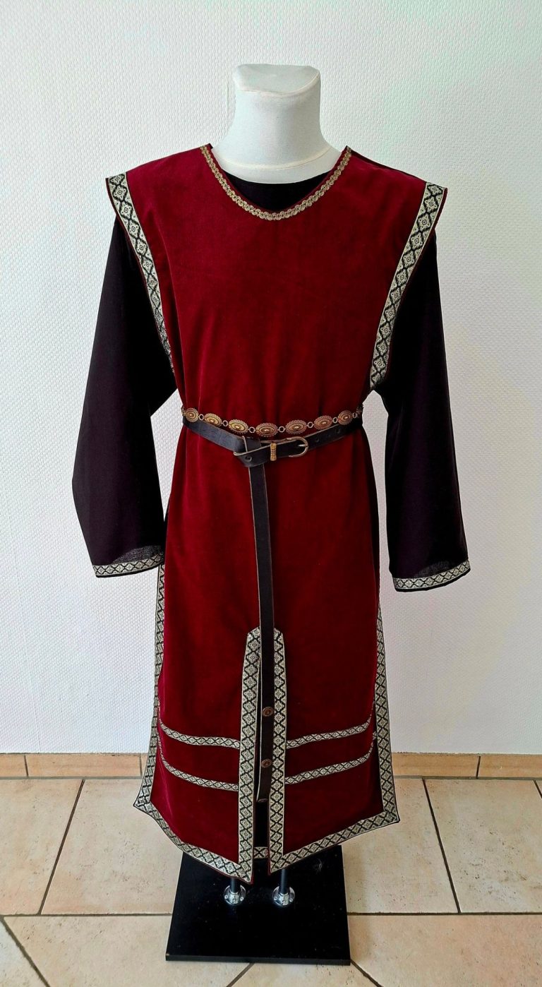 Hier bieten wir eines unserer sogenannten " Präsentationsmodelle " zum deutlich reduzierten Preis an. Es handelt sich um eine Herren Gewandung, bestehend aus einer langen Baumwoll-Tunika mit seitlichem Geschlitz in schwarz und einem Waffenrock aus einem eleganten Feincordstoff in brdeauxrot. Dieser ist seitlich offen und vorne geschlitzt.
