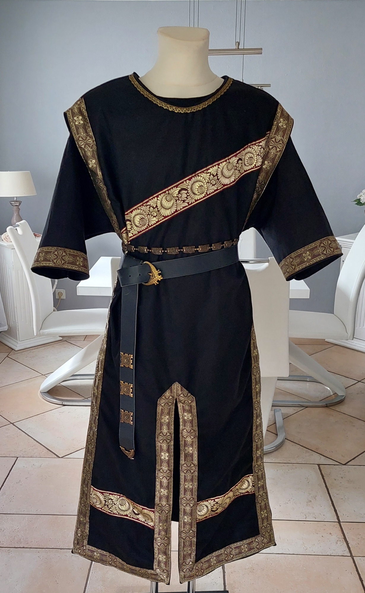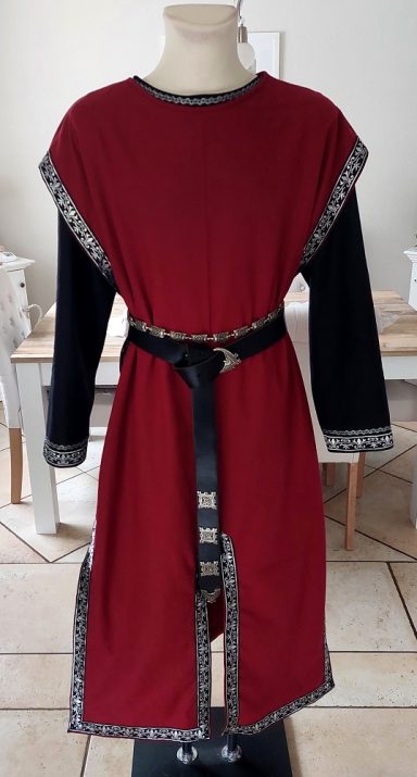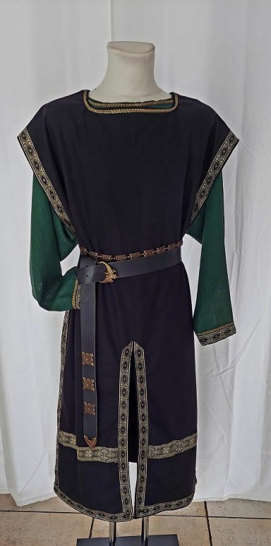 Tunika ( halblang) mit Waffenrock. Hier gezeigt aus einem schwarzen Leinen-Mischgewebe.Verziert mit einer Webborte.