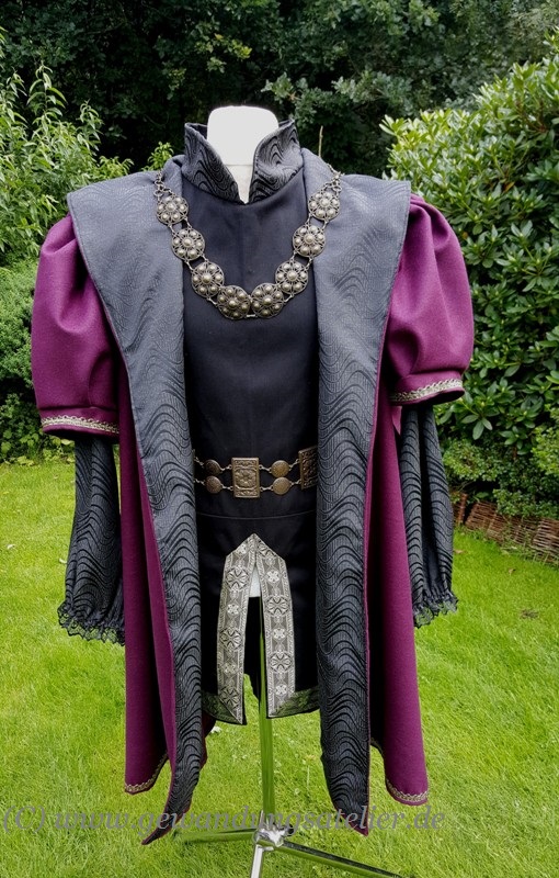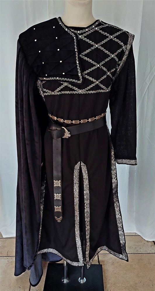 Herren Gewandung in schwarz-weiß-gold.Lange Tunika mit seitlichem Gehschlitz. Dazu passend ein Waffenrock.